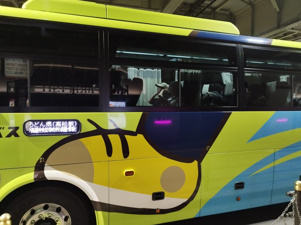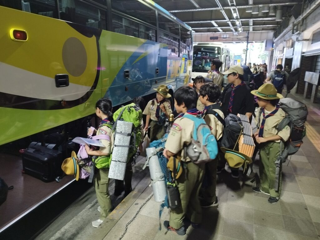 朝から大阪駅そばに集合してbs隊の夏キャンプの始まりです 今年は東かがわ市にある田の浦野営場で3泊を行います。まずはいきなり高速バスに乗って移動します。3列シートの豪華仕様に満足で移動します。初めて高速道路上のバス停で降りましたが無事にできました
