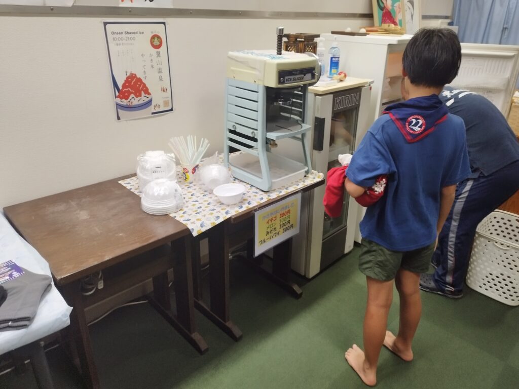 夜プログラムは少し離れた翼山温泉に入浴しに行きます。毎日シャワーは浴びているのですがやっぱり温泉は別格です。「温泉に入れるキャンプ」を堪能しました。終わった後はお待ちかねのかき氷を各スカウトは注文します。