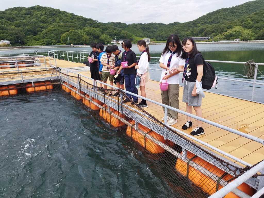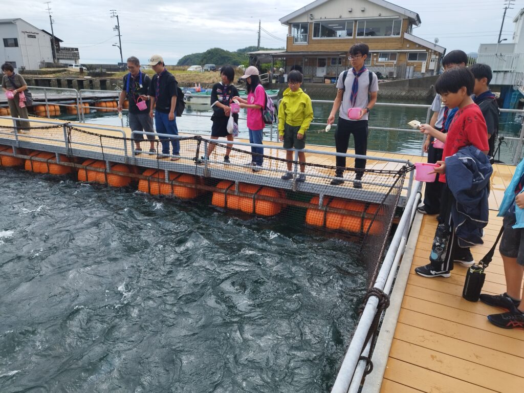 学習の後はハマチのエサやり体験をします。餌を投げ入れると素早く魚がエサを取りに来て水面が白くなります。背中を見ると色が違う魚がいるので聞いてみると栄養不足だそうです。餌を取る際にほかの魚に負けてしまってエサが取れないそうです。初めて聞く話にみんな驚きです。スカウトたちは狙って青い魚い餌をあげようとしますが、やはりうまくいきません