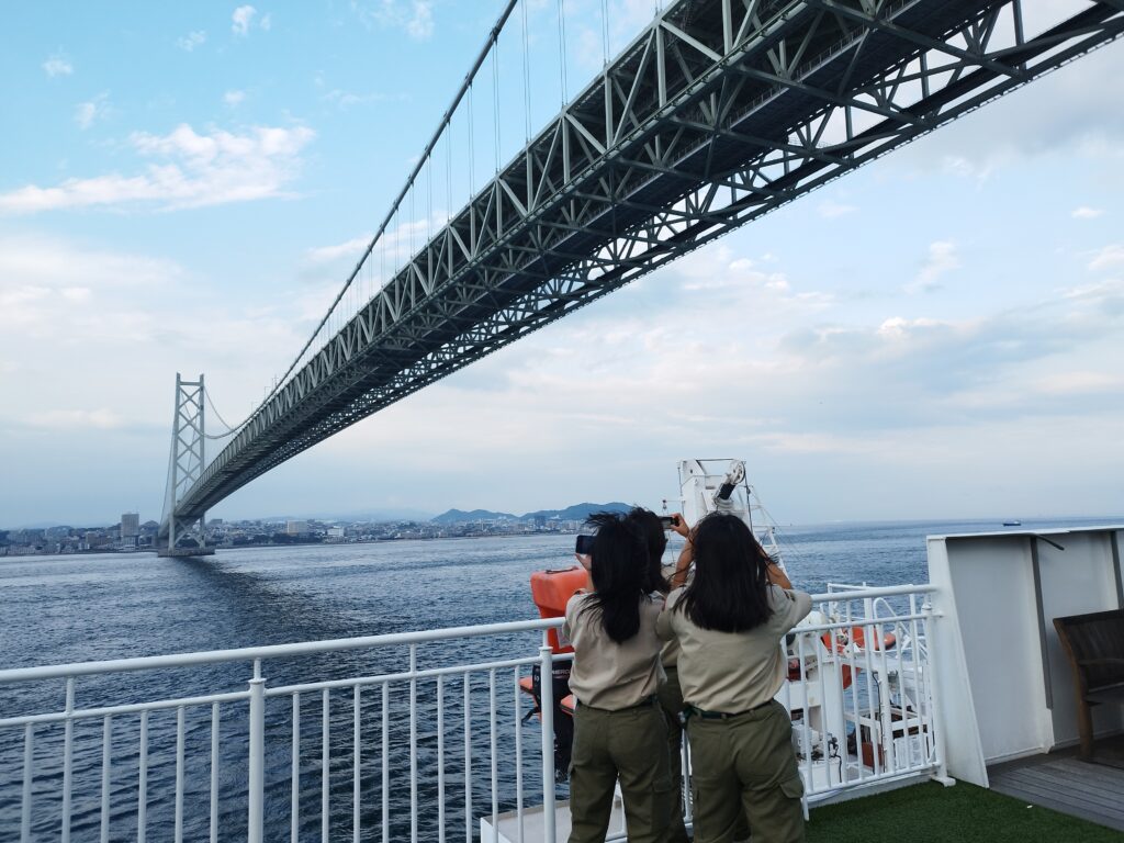 フェリーの旅もついに終わりです。今回のキャンプの閉会式は船の上で行います。閉会式を行う前に瀬戸内海を通るフェリーだけの特権、明石海峡大橋の下を通過する瞬間をみんなで楽しみました