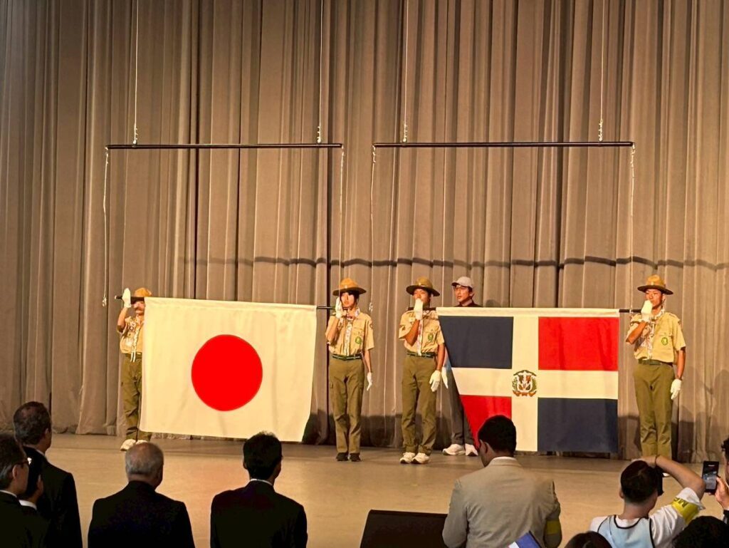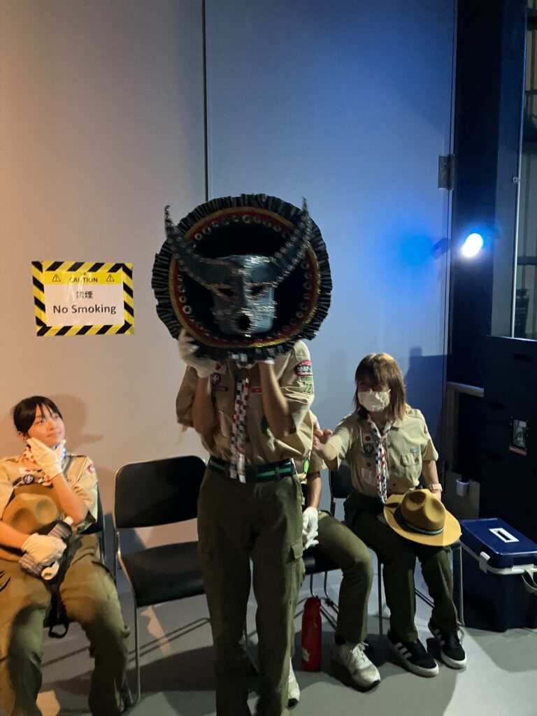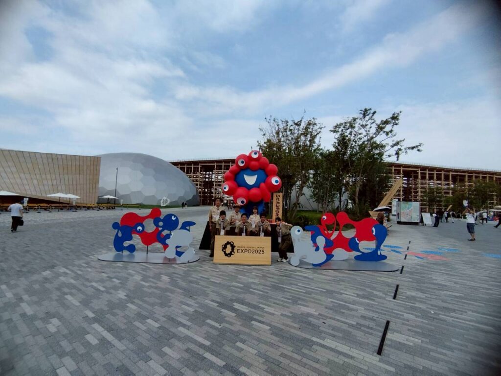 大阪関西万博においてN.D.(ナショナルデー)が開催されていますが、8月23日 カリブ海の国ドミニカ共和国のNDに当団のVSスカウト4人が国旗掲揚の奉仕に参加してきました。2か月ほど前から準備しての奉仕ですが、学校や個人で入場するのとは異なり開場前の会場は静かです。速足でレイガーデン裏に移動して当日の動きを確認します。国の紹介を見ていてもきれいな自然と花やかなカーニバルいよいよ会場内も埋まりスタート直前です。緊張して待っていると皆さんリラックスさせてくれるためか、カーニバルの仮面をつけさせてくれました。