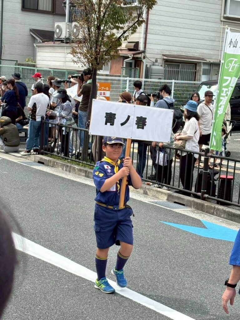 今日はビーバー隊からベンチャー隊まで、午前中は庄内野田中央公園でやってます豊中南部フェスティバルのパレードへの参加と、パレードのプラカード持ちの奉仕。