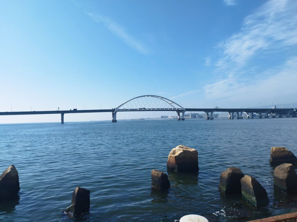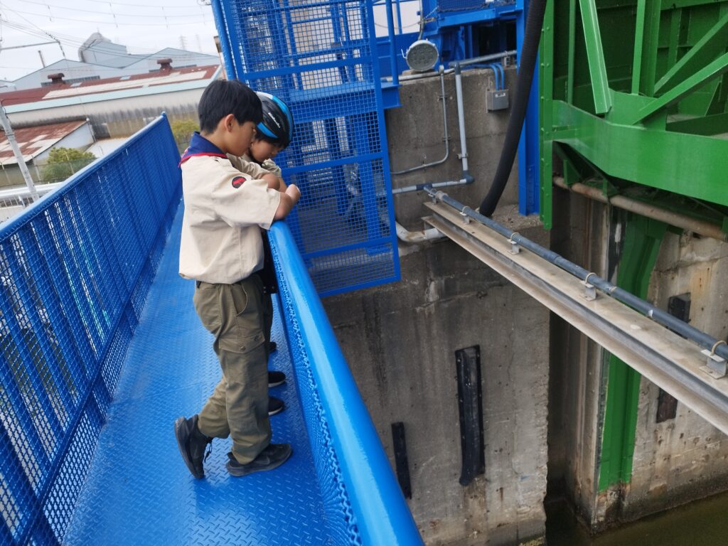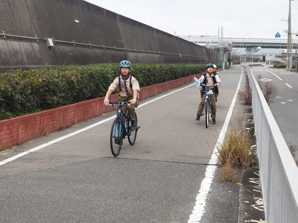 川を下りついに大阪湾まで来ました USJもすぐそばに見えるのでスカウトは大はしゃぎです(走ってる間ずっと大はしゃぎなので近づいてくるとすぐわかります)今日は暖かいですが曇り空でちょっと天気はいまいち 晴れてたらこんな景色です